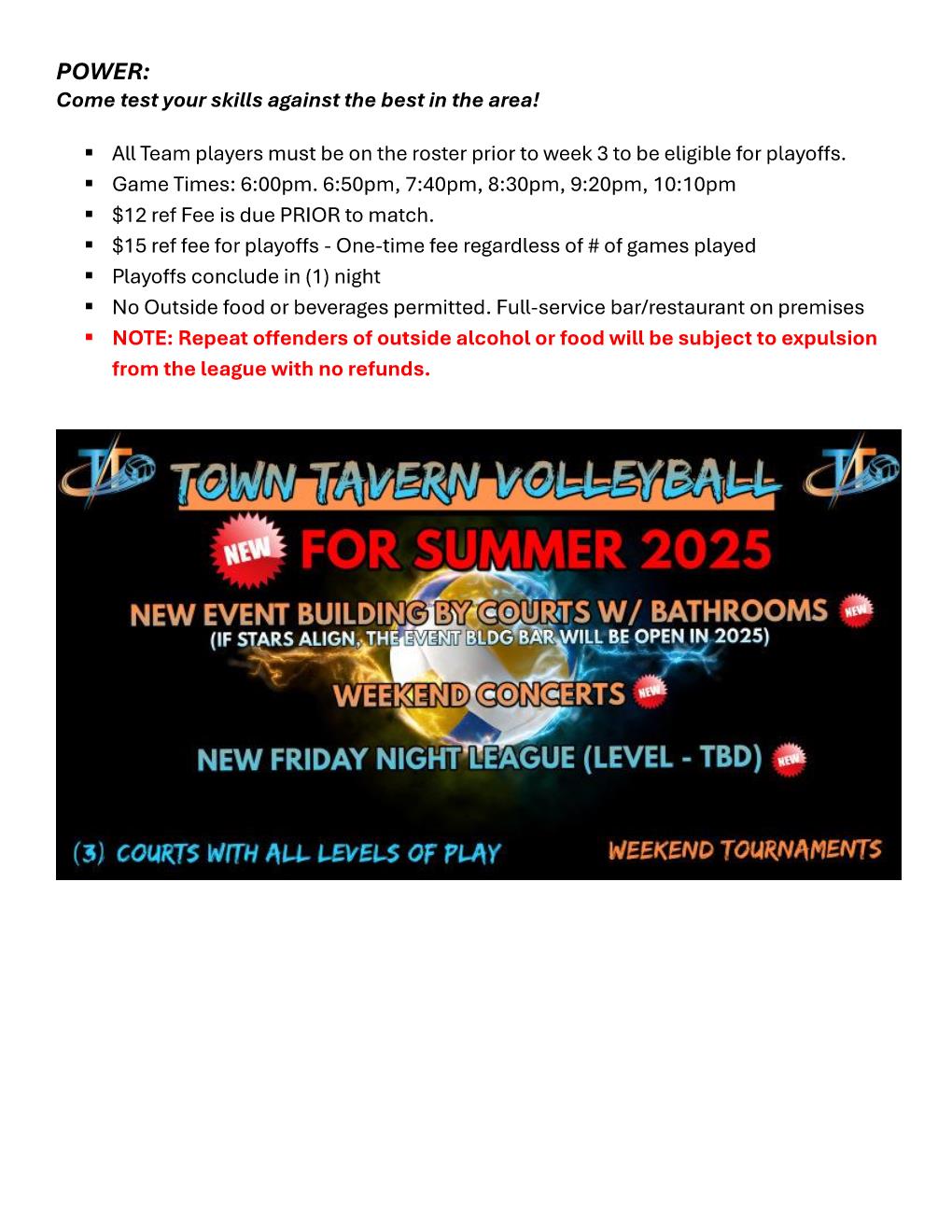 Check out this Volleyball (Sand) league '(4) '25-SPRING - THURSDAY: POWER MENS 4s' with Town Tavern Volleyball!